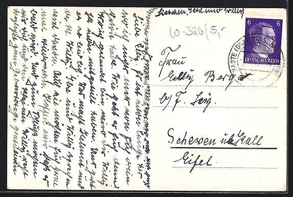 Personenbezogene Daten auf der Rückseite der Karte wurden durch blauen Textmarker unkenntlich gemacht. Die blauen Stellen sind auf die Vorderseite durchgeweicht und wirken sich negativ auf das Postkartenfoto aus