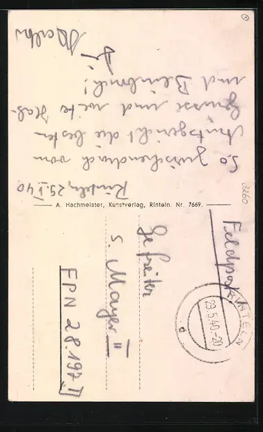 Personenbezogene Daten auf der Rückseite der Karte wurden durch blauen Textmarker unkenntlich gemacht. Die blauen Stellen sind auf die Vorderseite durchgeweicht und wirken sich negativ auf das Postkartenfoto aus