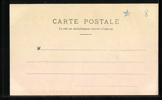 Personenbezogene Daten auf der Rückseite der Karte wurden durch blauen Textmarker unkenntlich gemacht. Die blauen Stellen sind auf die Vorderseite durchgeweicht und wirken sich negativ auf das Postkartenfoto aus