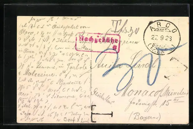 Personenbezogene Daten auf der Rückseite der Karte wurden durch blauen Textmarker unkenntlich gemacht. Die blauen Stellen sind auf die Vorderseite durchgeweicht und wirken sich negativ auf das Postkartenfoto aus