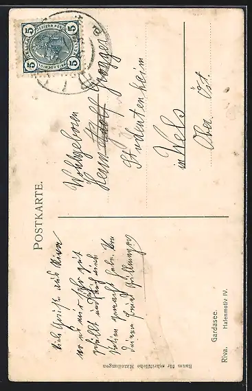 Personenbezogene Daten auf der Rückseite der Karte wurden durch blauen Textmarker unkenntlich gemacht. Die blauen Stellen sind auf die Vorderseite durchgeweicht und wirken sich negativ auf das Postkartenfoto aus