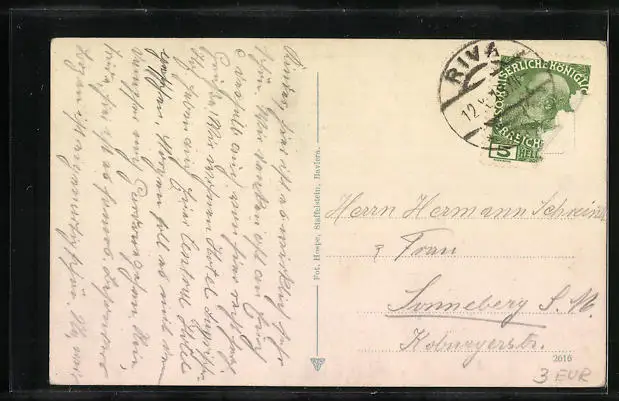 Personenbezogene Daten auf der Rückseite der Karte wurden durch blauen Textmarker unkenntlich gemacht. Die blauen Stellen sind auf die Vorderseite durchgeweicht und wirken sich negativ auf das Postkartenfoto aus