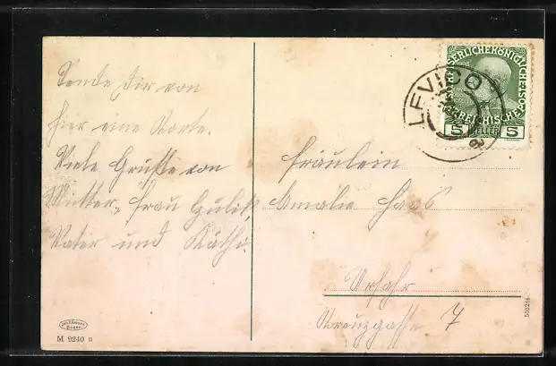 Personenbezogene Daten auf der Rückseite der Karte wurden durch blauen Textmarker unkenntlich gemacht. Die blauen Stellen sind auf die Vorderseite durchgeweicht und wirken sich negativ auf das Postkartenfoto aus