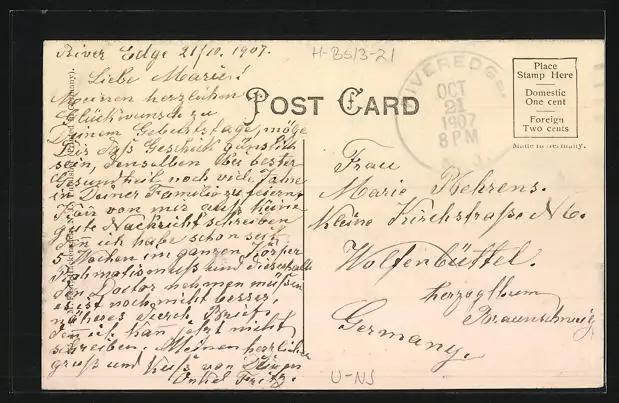 gelaufen 1907, Briefmarke entfernt, Eckknick unten links, guter Zustand