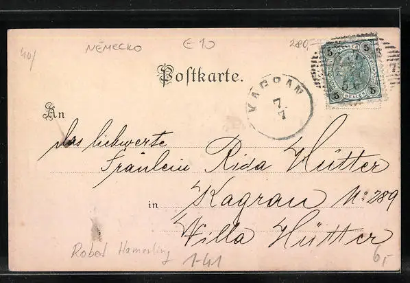 Personenbezogene Daten auf der Rückseite der Karte wurden durch blauen Textmarker unkenntlich gemacht. Die blauen Stellen sind auf die Vorderseite durchgeweicht und wirken sich negativ auf das Postkartenfoto aus