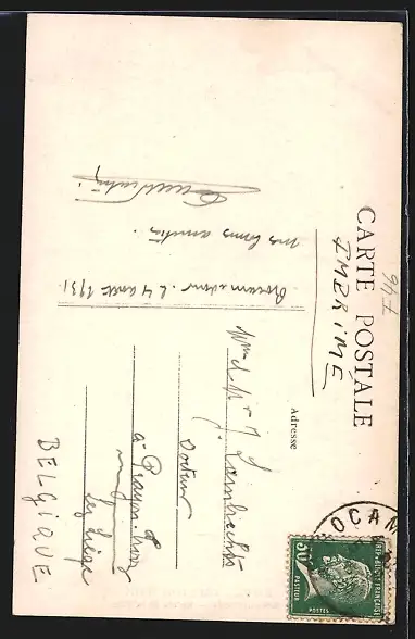 Personenbezogene Daten auf der Rückseite der Karte wurden durch blauen Textmarker unkenntlich gemacht. Die blauen Stellen sind auf die Vorderseite durchgeweicht und wirken sich negativ auf das Postkartenfoto aus