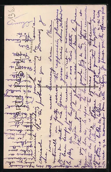Personenbezogene Daten auf der Rückseite der Karte wurden durch blauen Textmarker unkenntlich gemacht. Die blauen Stellen sind auf die Vorderseite durchgeweicht und wirken sich negativ auf das Postkartenfoto aus