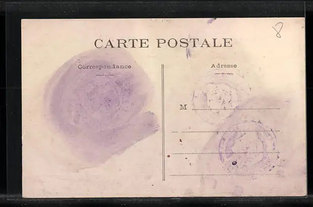 Personenbezogene Daten auf der Rückseite der Karte wurden durch blauen Textmarker unkenntlich gemacht. Die blauen Stellen sind auf die Vorderseite durchgeweicht und wirken sich negativ auf das Postkartenfoto aus