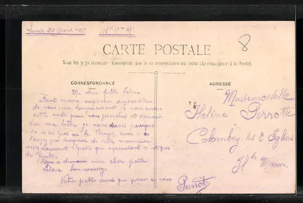 Personenbezogene Daten auf der Rückseite der Karte wurden durch blauen Textmarker unkenntlich gemacht. Die blauen Stellen sind auf die Vorderseite durchgeweicht und wirken sich negativ auf das Postkartenfoto aus
