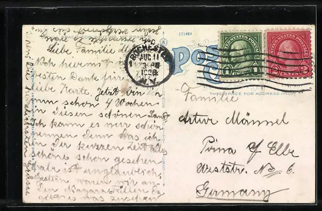 Personenbezogene Daten auf der Rückseite der Karte wurden durch blauen Textmarker unkenntlich gemacht. Die blauen Stellen sind auf die Vorderseite durchgeweicht und wirken sich negativ auf das Postkartenfoto aus