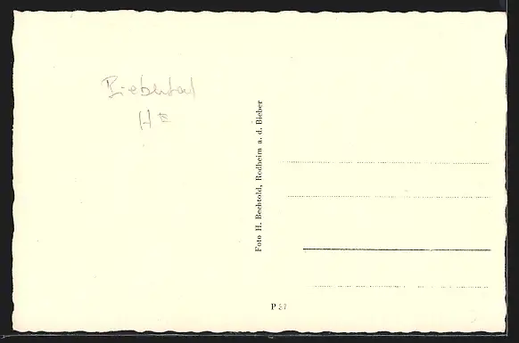 Personenbezogene Daten auf der Rückseite der Karte wurden durch blauen Textmarker unkenntlich gemacht. Die blauen Stellen sind auf die Vorderseite durchgeweicht und wirken sich negativ auf das Postkartenfoto aus