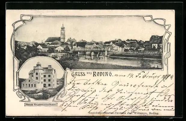 AK Roding, Teilansicht mit Kirche, Neues Knabenschulhaus