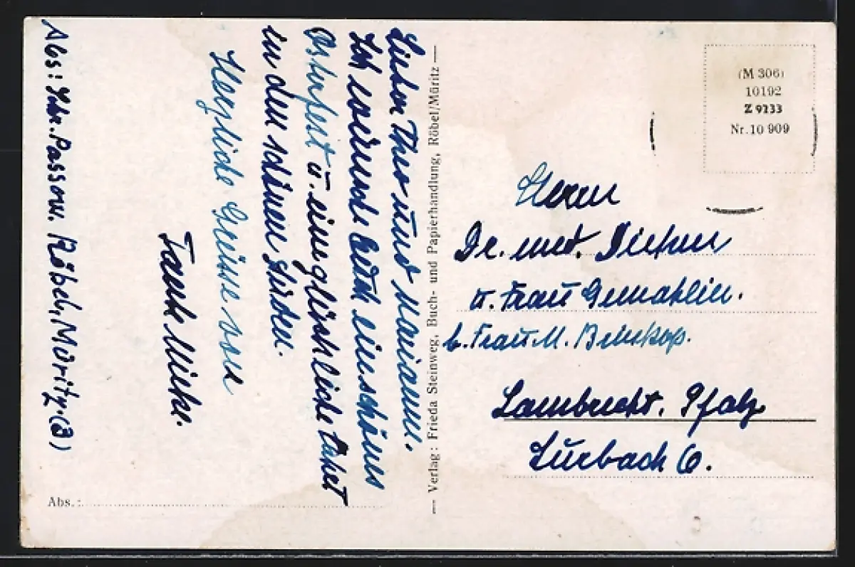 Personenbezogene Daten auf der Rückseite der Karte wurden durch blauen Textmarker unkenntlich gemacht. Die blauen Stellen sind auf die Vorderseite durchgeweicht und wirken sich negativ auf das Postkartenfoto aus