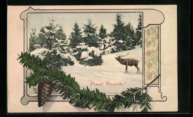 AK Röhrender Hirsch im Schnee, Neujahr