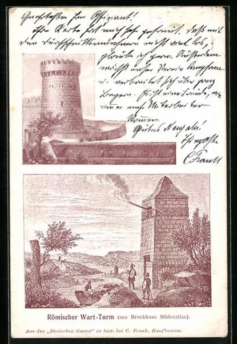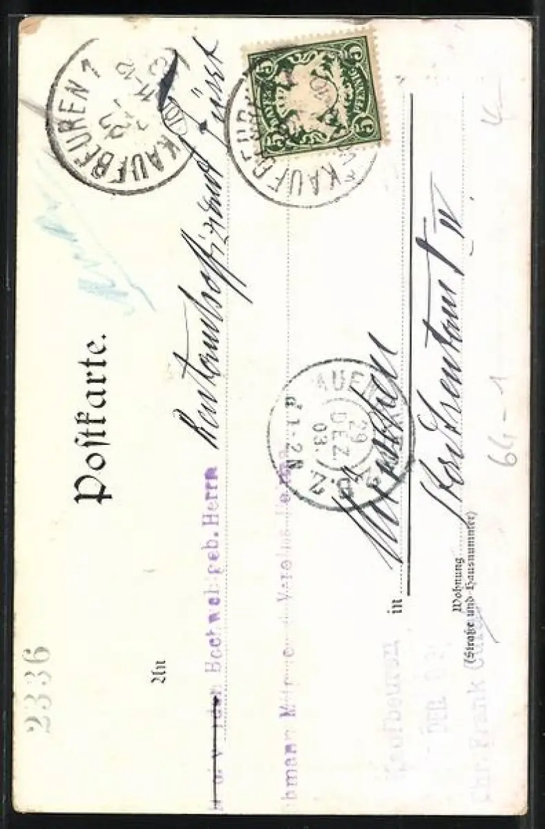 Personenbezogene Daten auf der Rückseite der Karte wurden durch blauen Textmarker unkenntlich gemacht. Die blauen Stellen sind auf die Vorderseite durchgeweicht und wirken sich negativ auf das Postkartenfoto aus