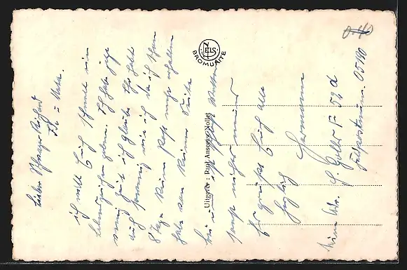 Personenbezogene Daten auf der Rückseite der Karte wurden durch blauen Textmarker unkenntlich gemacht. Die blauen Stellen sind auf die Vorderseite durchgeweicht und wirken sich negativ auf das Postkartenfoto aus
