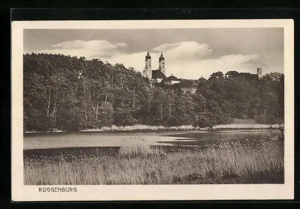 AK Roggenburg, Blick vom Ufer zur Kirche