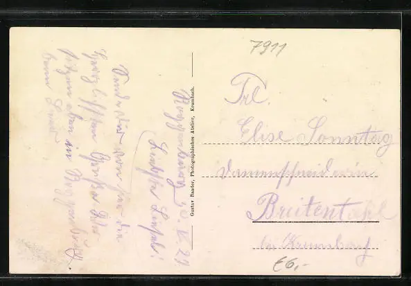 Personenbezogene Daten auf der Rückseite der Karte wurden durch blauen Textmarker unkenntlich gemacht. Die blauen Stellen sind auf die Vorderseite durchgeweicht und wirken sich negativ auf das Postkartenfoto aus