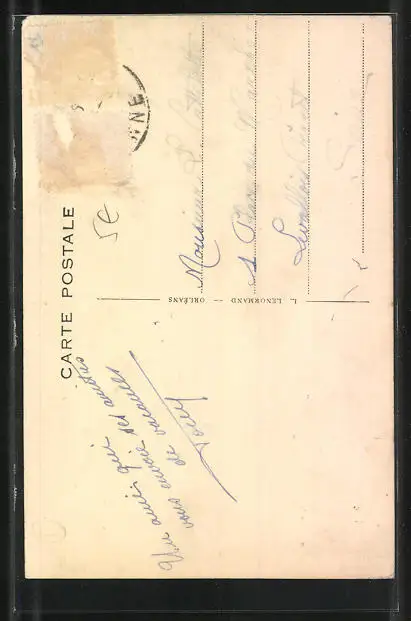 Personenbezogene Daten auf der Rückseite der Karte wurden durch blauen Textmarker unkenntlich gemacht. Die blauen Stellen sind auf die Vorderseite durchgeweicht und wirken sich negativ auf das Postkartenfoto aus