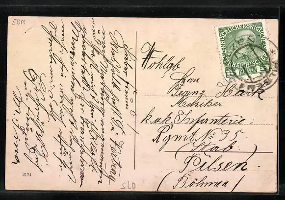 Personenbezogene Daten auf der Rückseite der Karte wurden durch blauen Textmarker unkenntlich gemacht. Die blauen Stellen sind auf die Vorderseite durchgeweicht und wirken sich negativ auf das Postkartenfoto aus
