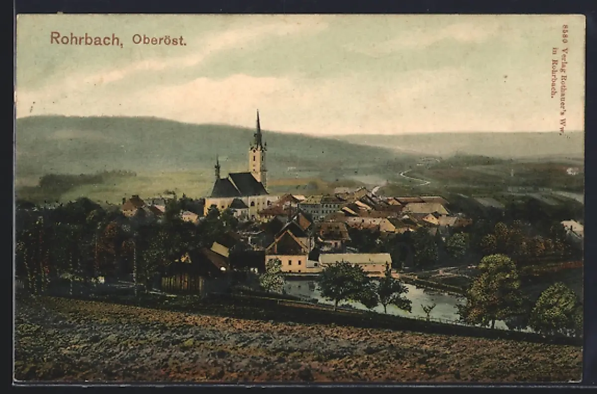 AK Rohrbach /O.-Ö., Totalansicht mit Gewässer und Fernblick von einem Acker aus