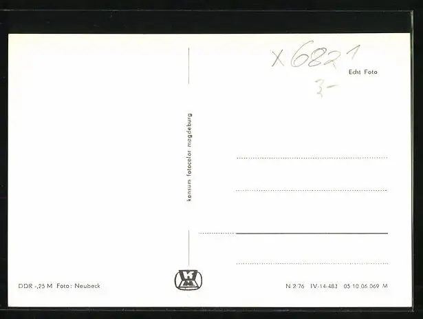 Personenbezogene Daten auf der Rückseite der Karte wurden durch blauen Textmarker unkenntlich gemacht. Die blauen Stellen sind auf die Vorderseite durchgeweicht und wirken sich negativ auf das Postkartenfoto aus