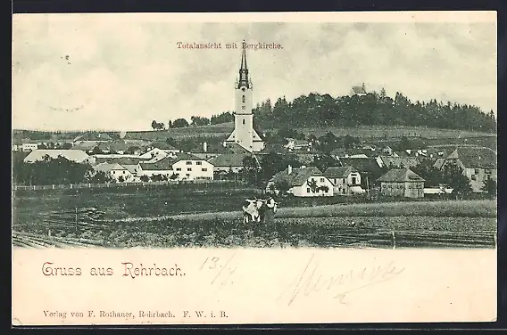 AK Rohrbach, Totalansicht mit Bergkirche, Feldern, Bauer mit Ochsengespann