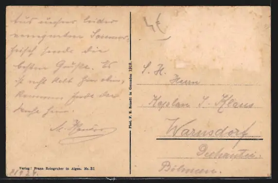 alte Ansichtskarte, ungelaufen, rückseitig Oberflächenschaden, Eckknick links oben, leichter Einriss am oberen Rand, guter Zustand