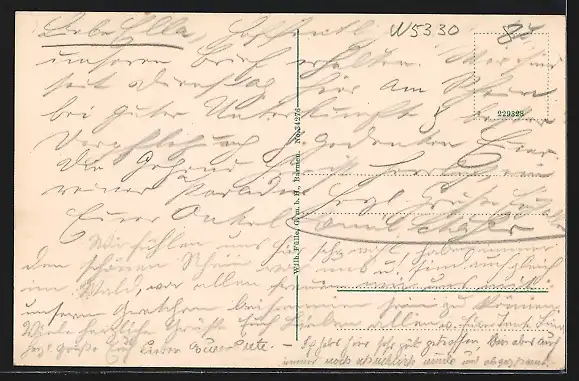 Personenbezogene Daten auf der Rückseite der Karte wurden durch blauen Textmarker unkenntlich gemacht. Die blauen Stellen sind auf die Vorderseite durchgeweicht und wirken sich negativ auf das Postkartenfoto aus