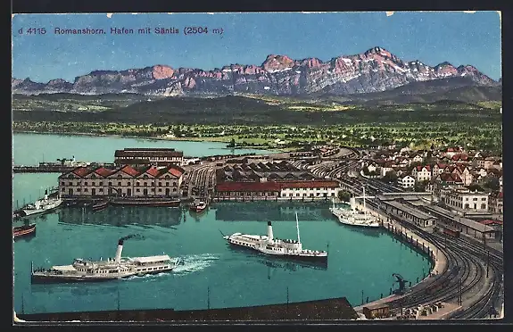 AK Romanshorn, Dampfer im Hafen, Säntis