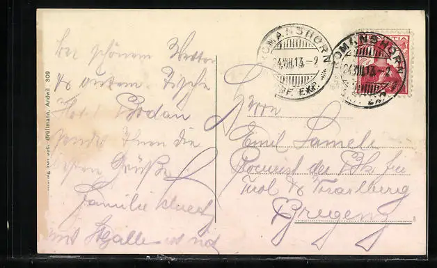 alte Ansichtskarte, gelaufen 1913, rückseitig Oberflächenschaden, Stempelspur, guter Zustand
