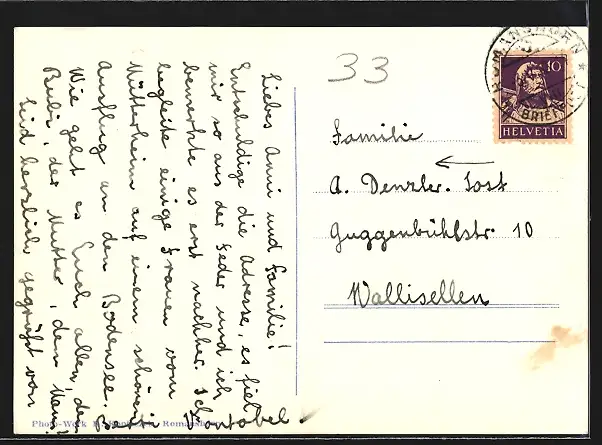 Personenbezogene Daten auf der Rückseite der Karte wurden durch blauen Textmarker unkenntlich gemacht. Die blauen Stellen sind auf die Vorderseite durchgeweicht und wirken sich negativ auf das Postkartenfoto aus