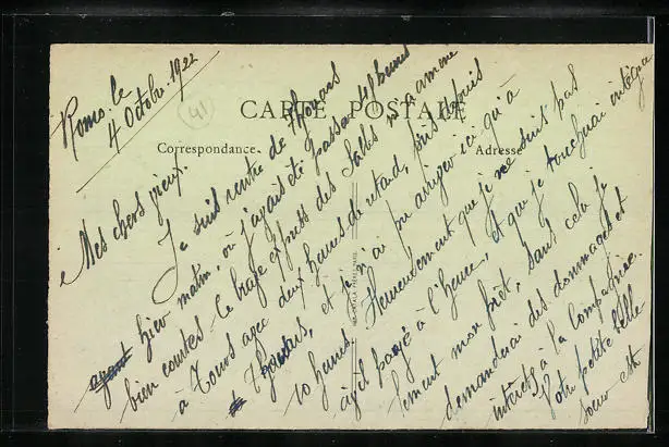 Personenbezogene Daten auf der Rückseite der Karte wurden durch blauen Textmarker unkenntlich gemacht. Die blauen Stellen sind auf die Vorderseite durchgeweicht und wirken sich negativ auf das Postkartenfoto aus