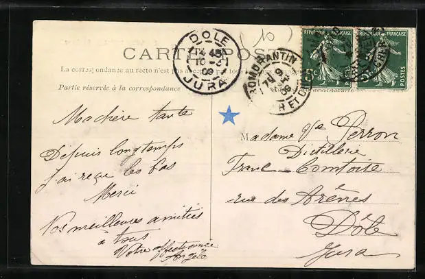 Personenbezogene Daten auf der Rückseite der Karte wurden durch blauen Textmarker unkenntlich gemacht. Die blauen Stellen sind auf die Vorderseite durchgeweicht und wirken sich negativ auf das Postkartenfoto aus