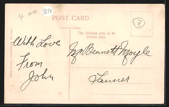 Personenbezogene Daten auf der Rückseite der Karte wurden durch blauen Textmarker unkenntlich gemacht. Die blauen Stellen sind auf die Vorderseite durchgeweicht und wirken sich negativ auf das Postkartenfoto aus