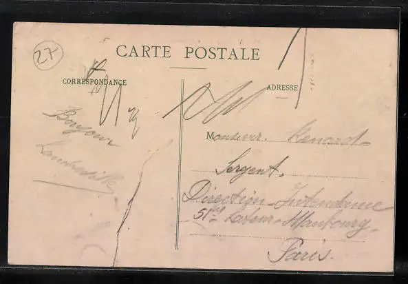 Personenbezogene Daten auf der Rückseite der Karte wurden durch blauen Textmarker unkenntlich gemacht. Die blauen Stellen sind auf die Vorderseite durchgeweicht und wirken sich negativ auf das Postkartenfoto aus