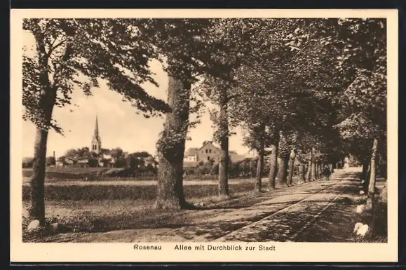 AK Rosenau, Allee mit Durchblick zur Stadt