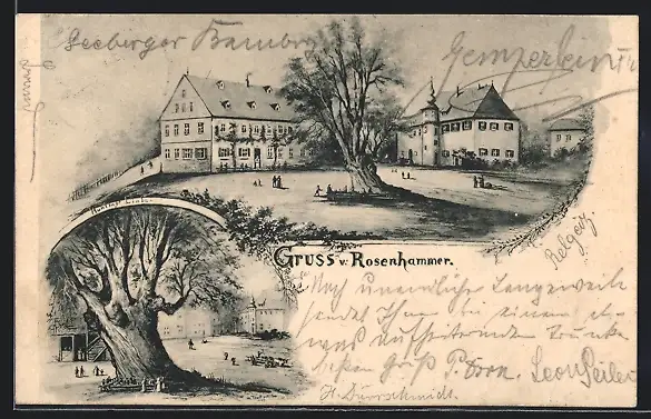 Personenbezogene Daten auf der Rückseite der Karte wurden durch blauen Textmarker unkenntlich gemacht. Die blauen Stellen sind auf die Vorderseite durchgeweicht und wirken sich negativ auf das Postkartenfoto aus