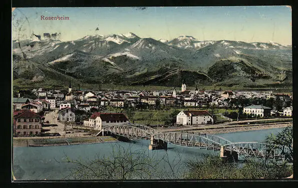 AK Rosenheim, Gesamtansicht mit Brücke und Kirchturm