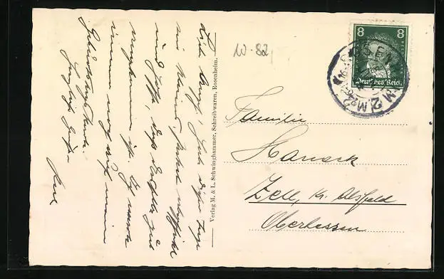 Personenbezogene Daten auf der Rückseite der Karte wurden durch blauen Textmarker unkenntlich gemacht. Die blauen Stellen sind auf die Vorderseite durchgeweicht und wirken sich negativ auf das Postkartenfoto aus