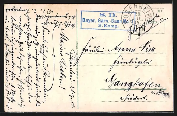 Personenbezogene Daten auf der Rückseite der Karte wurden durch blauen Textmarker unkenntlich gemacht. Die blauen Stellen sind auf die Vorderseite durchgeweicht und wirken sich negativ auf das Postkartenfoto aus