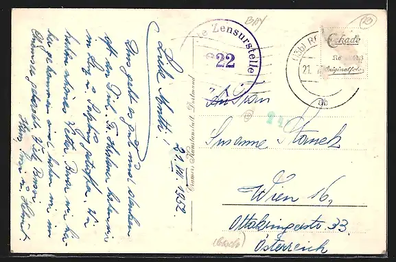 Personenbezogene Daten auf der Rückseite der Karte wurden durch blauen Textmarker unkenntlich gemacht. Die blauen Stellen sind auf die Vorderseite durchgeweicht und wirken sich negativ auf das Postkartenfoto aus