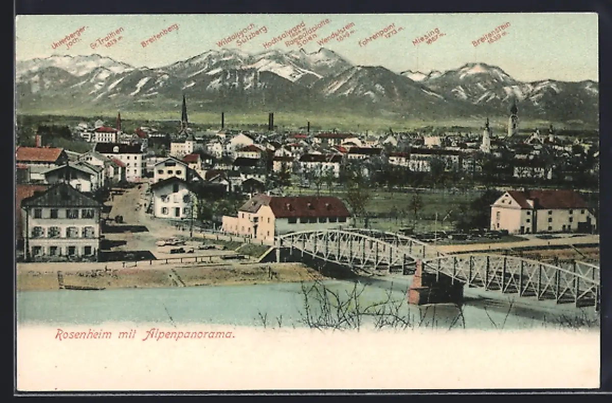 AK Rosenheim, Ortsansicht mit Alpenpanorama