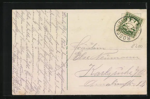 Personenbezogene Daten auf der Rückseite der Karte wurden durch blauen Textmarker unkenntlich gemacht. Die blauen Stellen sind auf die Vorderseite durchgeweicht und wirken sich negativ auf das Postkartenfoto aus