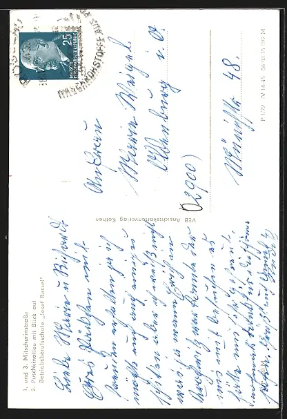 Personenbezogene Daten auf der Rückseite der Karte wurden durch blauen Textmarker unkenntlich gemacht. Die blauen Stellen sind auf die Vorderseite durchgeweicht und wirken sich negativ auf das Postkartenfoto aus