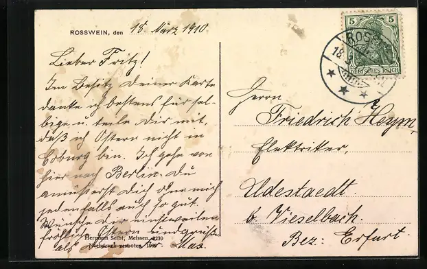 alte Ansichtskarte, gelaufen 1910, Eckknicke oben li. u. unten re., guter Zustand