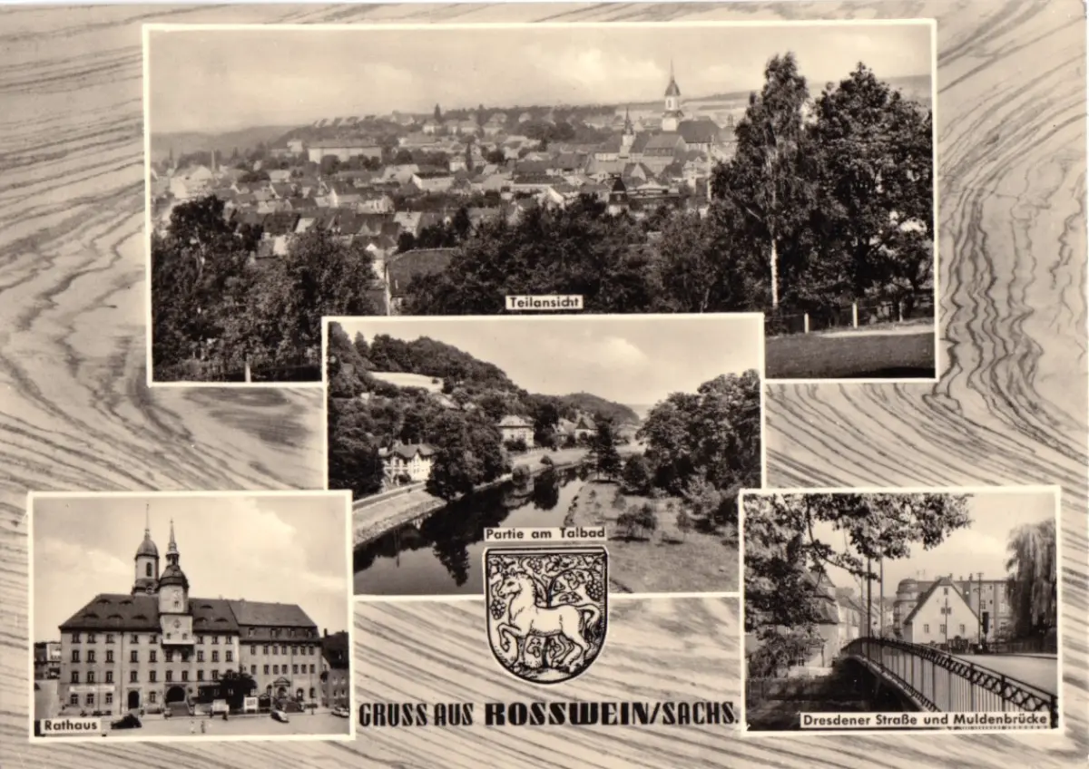 Ansichtskarte Rosswein Sachs. vier Abb., gestaltet Teilansicht, Partie am Talbad, Rathaus, Dresdener Str. und Muldenbrücke Erhaltung I-II postalisch gelaufen, gestempelt: Rosswein, 2.9.69 Druckvermerk: 1966 Herstellungsland: DDR Verlag: VEB Bild und Heimat, Reichenbach i. V. - 13/2039