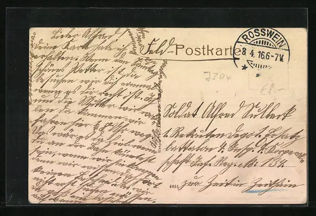 Personenbezogene Daten auf der Rückseite der Karte wurden durch blauen Textmarker unkenntlich gemacht. Die blauen Stellen sind auf die Vorderseite durchgeweicht und wirken sich negativ auf das Postkartenfoto aus