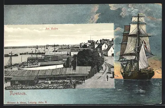 AK Rostock, Hafenpartie und abfahrendes Segelschiff mit Möwen