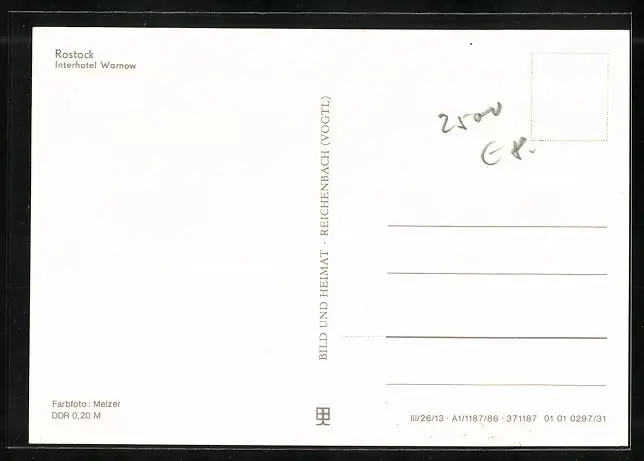 Personenbezogene Daten auf der Rückseite der Karte wurden durch blauen Textmarker unkenntlich gemacht. Die blauen Stellen sind auf die Vorderseite durchgeweicht und wirken sich negativ auf das Postkartenfoto aus